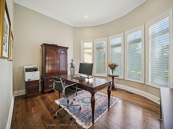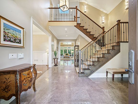Show-stopping luxury in the heart of Southwest Oakville! Set on a 75' x 150' lot, this custom-built residence offers the perfect blend of elegance and comfort. The professionally landscaped backyard oasis is a private retreat, complete with a fully fenced saltwater pool, manicured landscaping and towering 20-foot cedar trees that provide exceptional privacy. Multiple seating areas create a serene, resort-like atmosphere ideal for relaxation or entertaining, along with a spacious grassy area perfect for lawn games or children to play. Inside, the home's thoughtful design and impeccable craftsmanship are immediately evident. Hardwood flooring flows seamlessly throughout, enhancing the sense of continuity and sophistication from room to room. A main-floor office with a wall of windows creates a bright, inspiring workspace. The spectacular family room impresses with soaring vaulted ceilings, custom built-ins, and stunning doors that open to the backyard-ideal for indoor-outdoor living. Entertain in style in the open-concept dining area and true chef's kitchen, featuring top-of-the-line built-in appliances, a large centre island, premium cabinetry, and stone counters. A separate servery with a sink, beverage fridge, and ample storage provides convenient access to the formal dining room. The main-level primary provides the ultimate convenience and luxury, boasting a walk-in closet and a spa-inspired 5-piece ensuite. Upstairs, two additional bedrooms share a beautifully appointed 4-piece bath. The lower level extends the living space with a generous recreation room offering custom built-ins, gym, guest bedroom with walk-in closet, a den (which could be used as another bedroom), and a stylish 3-piece bath-perfect for guests or multi-generational living. A walk-up leads directly to the backyard for added ease. This remarkable home combines timeless elegance with modern amenities in one of Oakville's most coveted neighbourhoods.