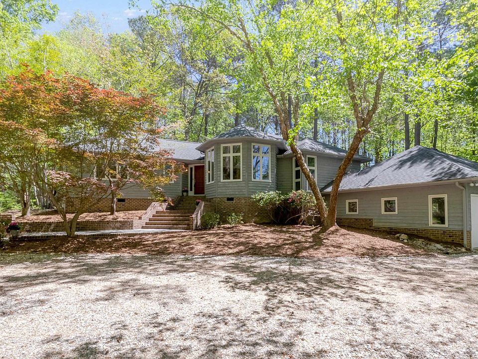 Updated contemporary on large 2.62 acre estate home site in N. Raleigh. Original home built in 1988 with major addition/renovation in 1995 &2023. Dual master bedrooms with walk in closets. New roof, paint, flooring, updated baths, lighting, plumbing fixtures and kitchen appliances. Huge family room with vaulted ceiling, skylight, cupola and fireplace. Oversized garage. Unique home in a beautiful setting.