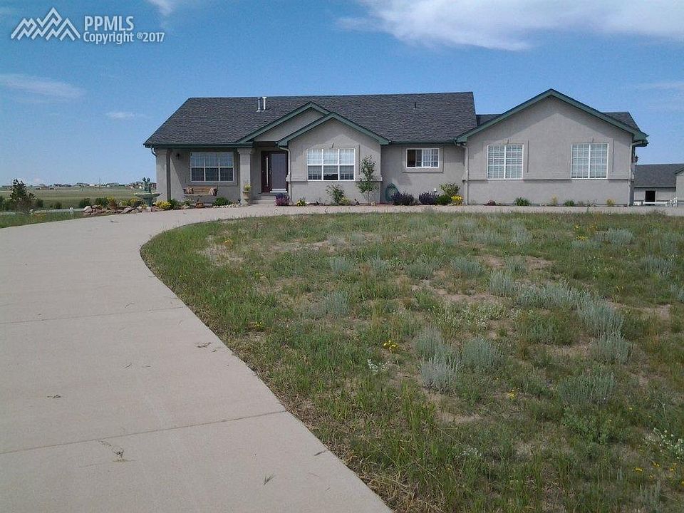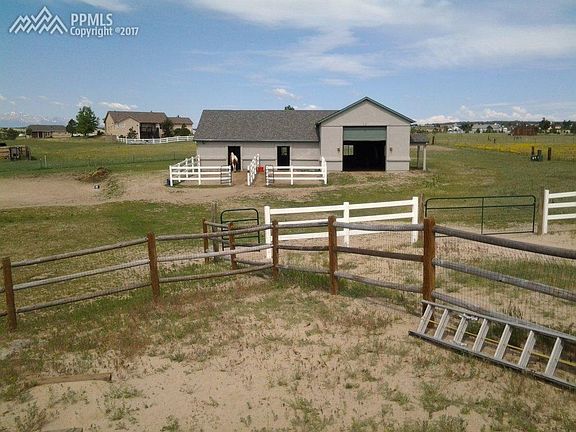 This custom rancher lies on the edge of Black Forest w/2x6 construction, maple cabinets & hardwood floors, oversized 3-car, heated garage & 360 degree views of the mountains, including Pikes Peak & the Front Range. This 5 acre property is 10 minutes away from Falcon schools, shopping, & recreation, golf, & by Latigo equestrian facilities! The amazing stucco barn offers 2 stalls, tack room, hay storage & inside trailer parking w/ overhead door! This 4 bed/3 bath home has country life & the city at your fingertips! The main level features hardwood floors and is built to capture the gorgeous views. The living room features gas fireplace, vaulted ceilings, and an open concept with sight lines to the rest of the floor. The gourmet kitchen features plenty of counter-space and cabinetry, a pantry, black on black appliances, and large island. The kitchen overlooks the large dining area. The main level master suite with vaulted ceilings, luxurious five-piece bathroom, and huge walk-in closet. Finishing the main level is the large laundry, office or secondary bedroom with full bathroom. The walkout basement features huge lower level game/recreation room with wet bar, two secondary bedrooms, and a 3/4 bathroom, and an additional bonus room for media or crafts/office. Bring your Class A Motorcoach here! The 2,500 sf barn/shop has a 12 ft door and 53 ft long. Barn features 2 Box stalls, water, elec. Multi use building. Plenty of room for that RV. The south side of the property backs open space and lots or riding, walking, wildlife, and birding available. Totally turnkey. All in excellent condition