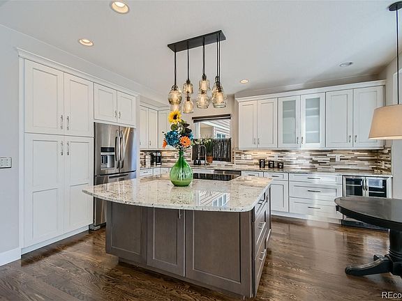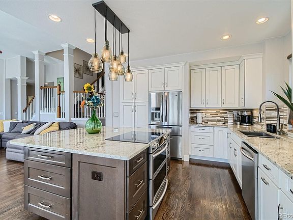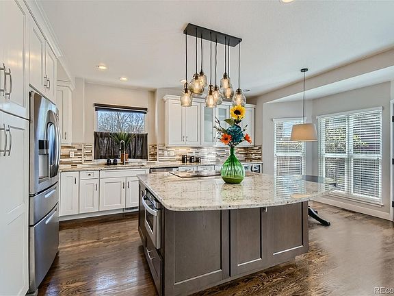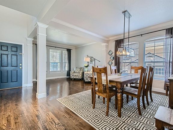 Quality two-story home in The Greens at Hunters Glen neighborhood. 4 Bedroom + Office, 4 Bath home with beautiful oak hardwood floors throughout entire main floor and 2nd story. Sun-filled south facing windows light up the updated kitchen with a grand island and eat in kitchen. Open layout to the living room with a stacked stone fireplace and the main level has a dedicated office, laundry and full bath. Upstairs the hardwoods flow into a master suite with five piece bath, plus 3 more bedrooms and a full bath. The basement is fully finished with a media area, game/dining area, recreation bar and another 3/4 bathroom. Great outdoor backyard entertaining area with south facing sun, concrete patio, fireplace, tool shed and sprinkler system. Good bones, new HVAC system, oversized 3-car garage. Neighborhood HOA amenities include a fantastic clubhouse, pool, playground, tennis court and volleyball court all with access to the community. Convenient location to the Premier Denver Outlet Mall, 1.5 miles from east lake light rail station, I-25, Top golf, The Orchard Town Center, and E-470 is right down the road. Must See!