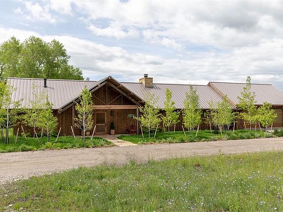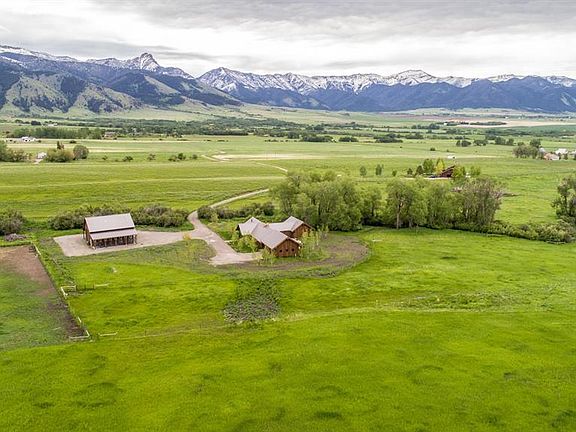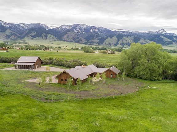 This exquisite property offers a private setting with exceptional Bridger Mountain views. The home was designed and built to exciting detail by Kipp Halvorsen and Yellowstone Traditions and has private vistas of mountains or meadows from every window. The living room features a wood burning fireplace with vaulted ceiling and custom bookshelves. The kitchen is bright with floor to ceiling windows highlighting the majestic Bridger Mountains. Custom soft close cabinets with Limestone counters, Gaggenau appliances and barn doors concealing the pantry create the most pleasant space to cook a meal or relax. Wet bar with glass tile backsplash, cherry cabinets, undercounter wine cooler, refrigerator and ice machine adjacent to kitchen. The library/den is accessed via custom French doors flanked by bookcases. Additional double doors provide access to the large stone patio. Large barn/shop has radiant in floor heat, 8 dog runs and hay storage. Fenced for horses.