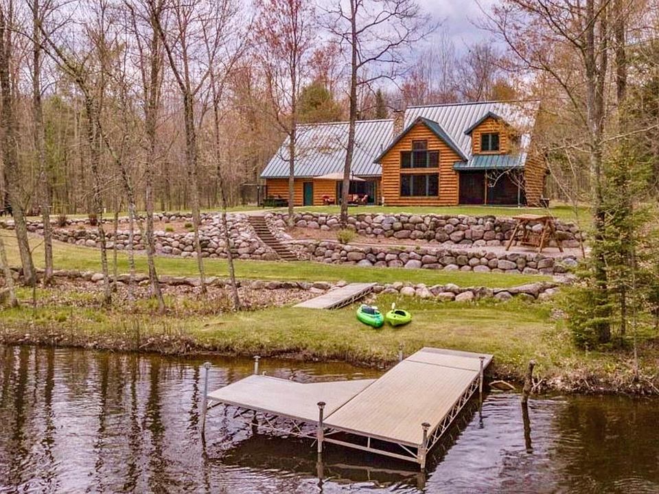 Nestled on 4.66 acres with 383' of frontage on the Oconto River North Branch, this home offers breathtaking views and direct water access with a private dock. Just down the road, a boat landing connects to Chute Pond. Inside, the kitchen boasts granite counters, hickory cabinets, and a large island. Floor-to-ceiling windows and wood cathedral ceilings bring in stunning river views. Enjoy the 4-seasons room with a built-in grill, hood, and hot tub hookups. The main-floor primary suite features a walk-in closet, full bath, and private porch. Set on a secluded, wooded lot with exquisite landscaping, the property is buildable for future expansion. Heated 4-car garage and an unfinished lower level, stubbed for a bath, offer endless potential.Furniture negotiable, driveway easement.