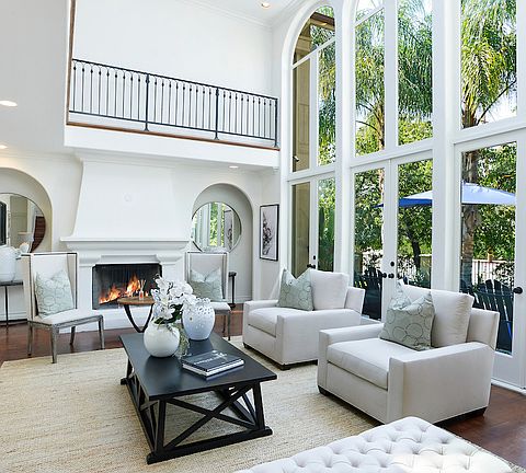 Exquisite Mediterranean inspired estate w/exceptional build & finish. The formal entry & vaulted great room greets you with 25' soaring ceilings & an enclosed glass atrium. A spectacular value, complete w/5bds (all en-suite), a powder room, gated entry & over 4K sq.ft. The entire floor plan is light filled & features, floor to ceiling windows in the living room, French doors, a dramatic fireplace & custom art niches. A romantic master suite is located privately on the 2nd floor, w/double walk-in closets & expansive deck w/pergola. The Kitchen incl top of the line stainless steel appliances, an adjacent laundry/wash room & a walk-in pantry. A spacious breakfast & family room that opens to a grassy backyard w/ ample room for a pool. The 2nd floor continues with a pvt office w/built-ins & fireplace, 2 addtl en-suite bds w/custom built-ins and French doors leading to their own Juliet balconies. Additionally, there's a finished 2 car garage, perfect for a studio, gym or rec room.
