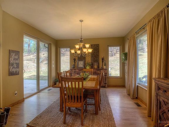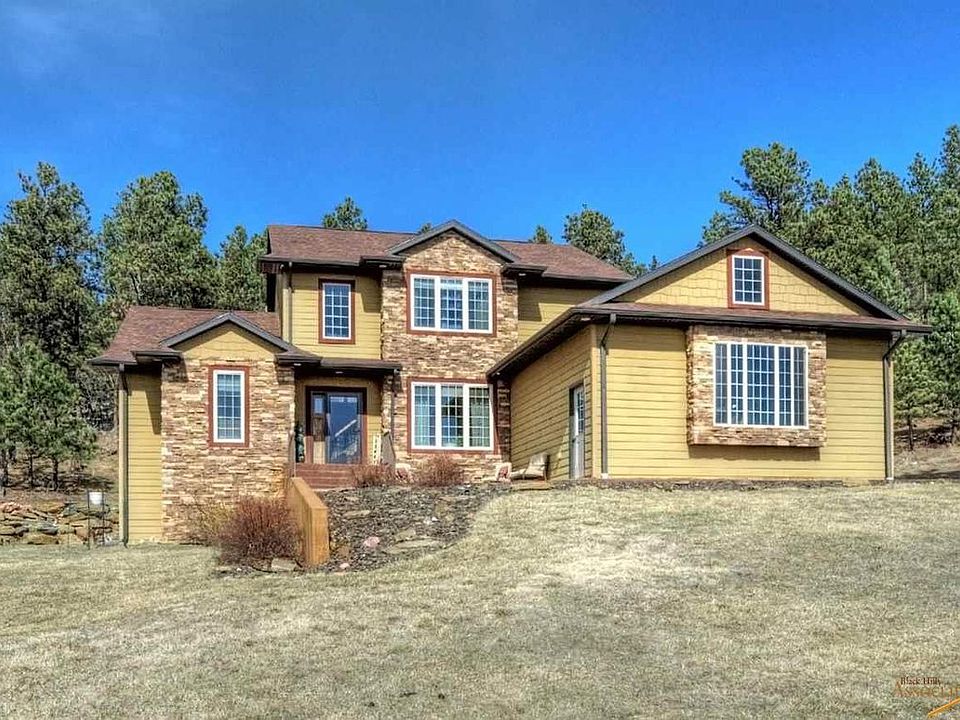 Custom home on a private three-acre lot just minutes outside Rapid City. Perfectly positioned to capture a private, hills setting to the rear while offering wide-open views and plenty of sunlight from the front. Custom gourmet kitchen with solid surface tops, built in double oven and elevated breakfast bar opens to a tremendous two-story living room perfect for large gatherings. Master suite includes fireplace, tiled shower, double vanity, jetted tub and ample closet space. Main floor office off of grand entry, formal dining, well-planned laundry/mud room with individual storage compartments and utility sink leads to a heated three stall garage. Lower level features a second built-in entertainment center, custom wet bar with new stone fireplace and large craft/play room in addition to the fourth and fifth bedrooms.Beautiful home inside and out!