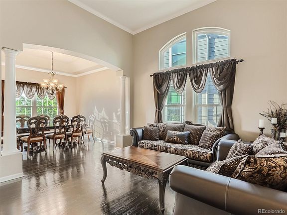Do you want to live on the golf course? This move-in ready gorgeous 2-story, 3 car garage is the only home in Hunters Glen that backs to the golf course on the market! You better run to this one! This home has newer exterior paint, refinished wood floors on the main level, and stacked stone wood accents around the fireplace and kitchen island. The main floor offers both a formal living room with high ceilings and family room with a gas fireplace. The kitchen has a eating space and is completely updated with a WIFI enabled dishwasher. It also walks out onto the back deck that overlooks the golf course. Main floor office could be used as a non-conforming 5th bedroom. The finished walk-out basement features a bar, pool table (which is included), theater room (projector and screen is included) could also be used for the non-conforming 4th bedroom, 3/4 bathroom, and an office/den space. Upstairs you will find a grand primary suite with amazing mountain views, tray ceiling, 5-piece bathroom, with walk-in closet. Talk about convenient location, the pool and clubhouse which is beautiful and available to rent and also has showers and changing rooms is super close, the Premier Denver Outlet Mall is less than 5 minutes away. As is I-25. Top golf, The Orchard Town Center, and E-470 is right down the road. Don't miss out on this one!
