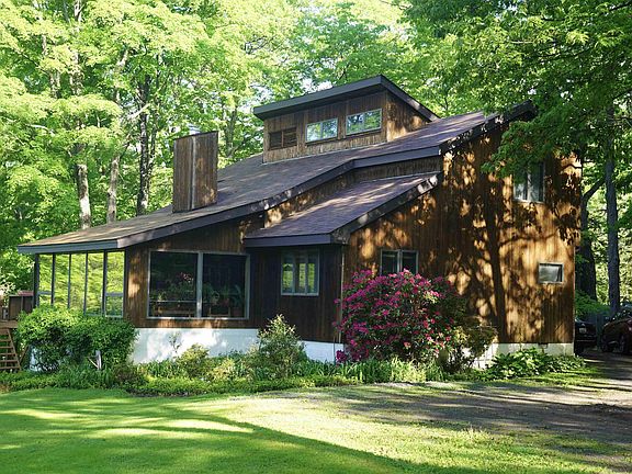 WELCOME TO THE PRIVACY LOCATION AND VIEW YOU'VE BEEN WAITING FOR...This compound ready property has been developed with artful intention on 8.97 acres. This first time on the market 3 bedroom 2.5 bath home with 1 bedroom casita was built with love, quality and efficiency. A long driveway opens to reveal captivating landscaping, multilevel lawns, stonewall tiered gardens, slate walking paths and a small pond. Each structure is perfectly placed on the land to maximize the view and privacy. The main house is a custom built cedar sided light bright open Contemporary with a Danish Mod flare. The first floors luxurious sunroom has slate flooring and expansive windows offering stunning views of the surrounding property. The entryway opens into spacious living room with an impressive 2 story fire place, hardwood floors throughout, and vaulted cedar plank ceiling. The kitchen has solid oak cabinetry handcrafted by a local artisan, excessive storage and a center island and access to the attached 2 car garage. The dining room has coordinating oak cabinetry and a large slider giving access to an expansive wrap around second story deck overlooking the woods, meadows and mountains. A private primary bedroom with ensuite bathroom and walk in closet rounds out the amazing first floor. A floating oak staircase with landing leads to a loft, 2 bedrooms each with impressive walk in storage and shared full bath. The lower level, complete with laundry room, wood stove, and an exit/entrance to a stone path leading to lower garden and pond, could make for the perfect home office, play room, den or guest room. Attached two car garage with storage and separate outdoor parking. AND THERE'S MORE! This legal multi-family dwelling features a separate circular drive and parking for the exclusive use of a 1 BDRM 1 BATH cedar sided guest/passive income apartment atop a two car garage. Enter through the mudroom and immediately captured by the view through the expansive windows. The full sized kitchen is complete with pantry handcrafted cabinets, opens to a living room/dining room and slider that opens to from dining area to a large second-floor deck to enjoy the view. An abundance of closets in each room and a pull-down ladder for additional attic storage. The garage space below is currently configured with an over sized single-garage with floor to ceiling shelving and separate wood shop/workshop on the other side.