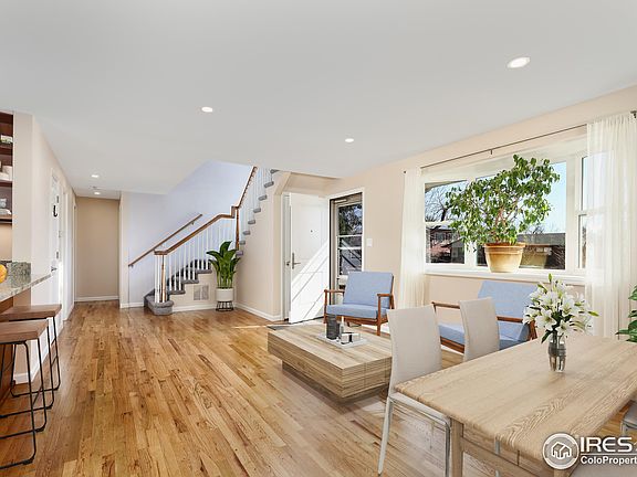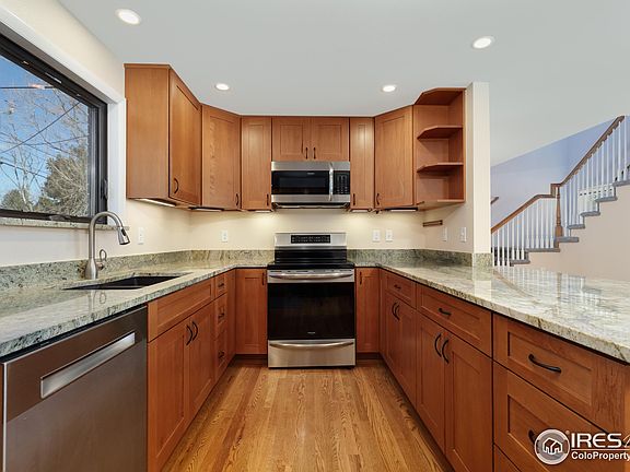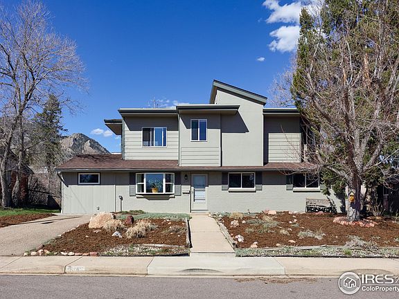 An incredible value in an amazing location and an impeccable, eco/green home. 1345 Georgetown is the epitome of Boulder living. TRAILS out one's doorstep. Graceful mountain VIEWS as your backdrop. Boulder's incredible schools a stroll away. Apple and plum trees line the fully fenced back yard oasis with a large, bike/storage shed. A green, eco conscience takes the helm with a SOLAR array and electric EE upgrades throughout replacing all gas. Turnkey, main level living with 3 of 4 bedrooms on the main, along with 2 bathrooms and laundry on the main. The nanny/in-law suite has a separate exterior and interior entry and is a great flex room as a tv/rec room/office combo and/or guest room/tv room. Upstairs is the spacious west facing living room (or amazing work from home study/office) with gorgeous mountain views and balcony along with the expansive primary suite with walk-in closet and beautifully tiled 3/4 bathroom. '19-'22 new: New roof. New water heater. New EE windows and doors. **Highest efficiency electric heat (& cooling) pump + mini splits for eco green and low energy expense living. Coupled with forced AC on the main floor. Fully remodeled kitchen with stunning, one of a kind, gem flecked garnet granite countertops + induction oven/range. Bedroom + bathroom with closet and laundry closet addition/remodel on the main. Impeccable annual maintenance including electrical upgrades and automatic shut off for plumbing along with new decking and exterior painting.