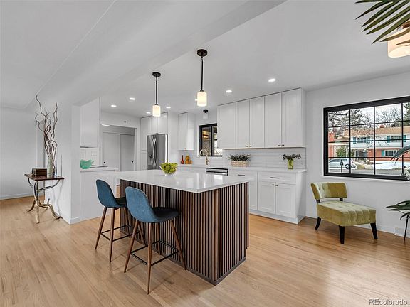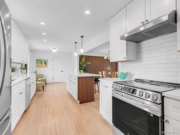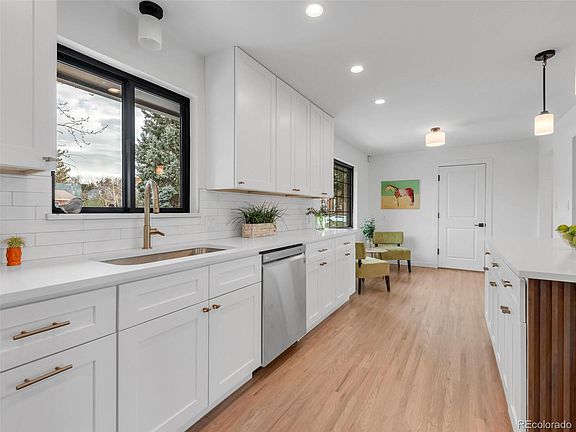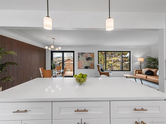 Stunning mid-century home w/ the perfect balance of modern & classic design elements that creates a truly one-of-a-kind home. Thoughtfully renovated, this all-brick ranch w/ walkout basement features an open concept floor plan & panoramic mountain views through large black frame windows. The kitchen is appointed w/ slabs of white quartz countertops, crisp white cabinets, stainless steel appliances, large kitchen island w/ pendant lighting & cozy breakfast nook for morning coffee. The adjoining dining room & living room are defined by the picturesque mountain views, flawless red oak hardwoods w/serene birch colored finish, charming coved ceilings & an elegant acoustic wood paneled wall for a refined touch. The light-filled primary suite promotes relaxation & comfort & features dual closets w/ custom shelving system for optimal storage & space for a cozy seating area. The luxurious attached bath w/ quartz-topped vanity has dual sinks & beautiful mirror & lighting combination, textured tile shower surround & touch of character w/ the original exhaust fan. Completing the main level are two additional bedrooms & full bathroom w/ stylish gold hardware, faucet, mirror, & lighting. The full walk out basement w/ large picture windows is bathed in natural light & overlooks the large & private backyard. The large & open space has endless possibilities & is ideal for a cozy family room, game area or entertaining. The perfect home office is tucked away & quiet w/ access to the backyard & a closet for additional storage. The lower level also features a nonconforming bedroom, a charming bathroom w/ mosaic tile flooring, large laundry room w/ countertops, cabinets & refrigerator for added convenience. The outdoor space is equally impressive & features an expansive deck w/ views from the Golden foothills to the Boulder Flatirons! Situated on over 1/3 of an acre, this private oasis is full of manicured grass, mature trees & bushes & epitomizes the Colorado lifestyle.