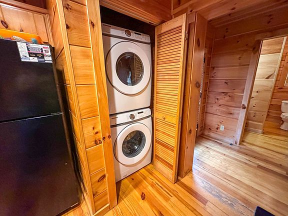 Log cabinTowering pine treesPrivate deckCozy interiorClassic linesQuaint kitchenWelcoming living space