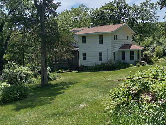 Nestled in a beautiful rustic setting this quaint country home of 2631 square feet, loaded with charm, warmth and enduring value. The home has 4 bedrooms, 3 baths situated on 9.71 acres in a serene, secluded area. A lane from the country road to the homesite, is just far enough away to assure privacy. Surround yourself with nature, bushes, shrubs, mature trees and small pond with water feature. A detached 2 stall garage and 3 sheds are on the property. A walkout basement provides storage and access. A primary suite with 2 generous closets is on the main level. Three additional bedrooms with spacious closets and a shared bath are upstairs. The living room has wood fireplace and adjacent den/sitting room near primary suite. The kitchen was remodeled with space for large dining table and access to sunroom with skylights and large windows for the spectacular view. All appliances are included. Laundry is on main level with storage space, pantry and guest bath. A whole house generator is included. Don't miss this quiet blend of acreage and privacy. Kitchen light fixture not included, to be replaced.
