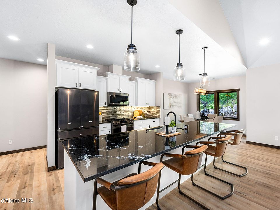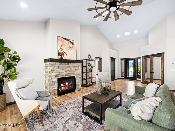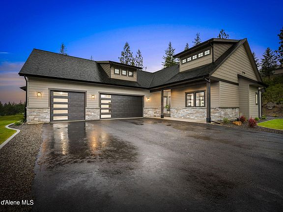 Store everything you need AND want with an oversized 34x40' garage w/ 8' tall doors in this brand new home that seamlessly blends contemporary luxury w/ rustic design! Spanning nearly 2800 SQFT w/ 4 bedrooms plus an office/den, 2 master suites, 3.5 bathrooms, jack & jill design for incredible functionality, high end luxury vinyl plank flooring, knotty alder doors and trim, wood wrapped windows throughout, top of the line black stainless steel appliances, vaulted ceilings in the main living area offering ample space and comfort. Step outside through your massive double door sliders onto the covered patio with a gorgeous cedar tongue and groove ceiling. You will want to see the 2nd master suite offering a private balcony with stunning 180-degree mountain and city views. Enjoy your fully landscaped lot with full sprinkler system to complete the picture for your perfect Idahome.You will not want to miss this once in a lifetime opportunity to live your dreams in North Idaho!