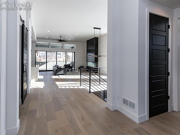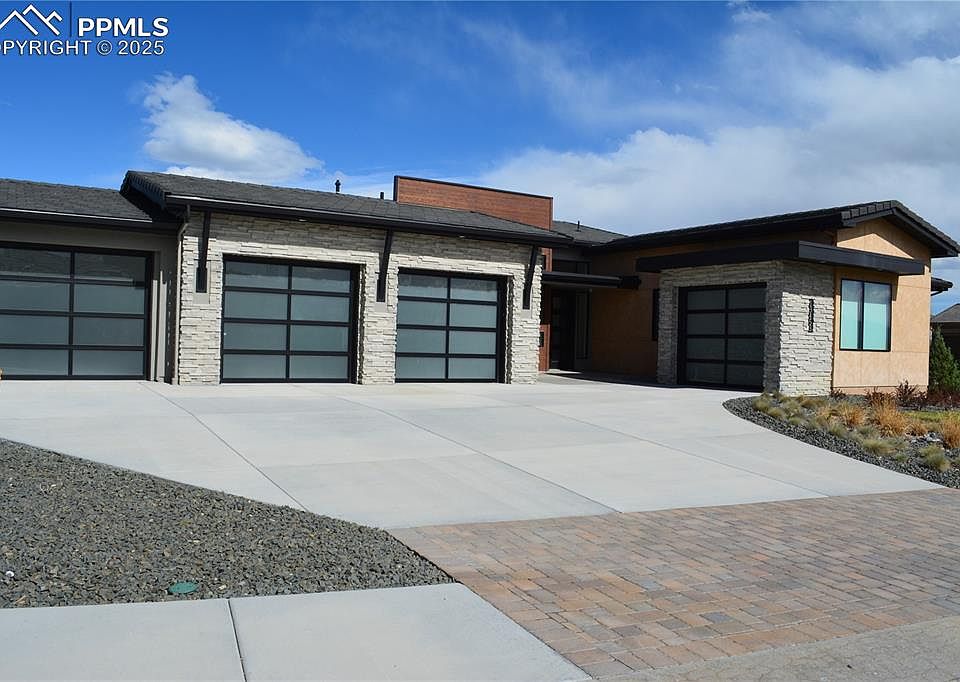 BETTER THAN NEW. Welcome to this State-of-the-art Modern Home located in the Prestegious gated community of Flying Horse-Village of Calistoga. Covered entry into a spectacular Great Room featuring a DaVinci custom fireplace, adjoining dining area & a western wall that opens to an over sized covered patio.Gourmet kitchen adjoins the great room and features upgraded Italian cabinets, upgraded quartzite counters, island with waterfall stone counters, built-in refrigerator, large gas cooktop, dbl ovens, microwave & custom vent fan, (all Miele appliances) & a pantry. Master bedroom features an adjoining master bath. Large walk-in shower features two rainheads and two shower heads, free standing soaking tub, double floating underlit vanity and large backlit mirror. Oversized Master closet with abundant shelving and access to finished laundry area/mud room includes custom cabinets, stone counters and Miele Clothes Washer and Clothes Dryer. Visitors will enjoy the private Guest Suite with sitting area, private 3/4 bath, large walk-in closet and a single car attached guest garage. An open and bright office completes the main level. Ascend down a dramatic floating staircase to the large family room with room for a theatre area, sitting area and an additional recreation space for a sitting area and/or pool table. Two additional bedroom that feature 3/4 attached bathrooms and large walk-in closets. Gym area & an additional half bath.10' celings in basement and 8' doors throughout the home. All showers are zero entry. Lutron custom window coverings are remote controlled. Remote controlled thermostats w/ three zones. Security System - multiple exterior cameras. Custom lighting throughout the entire home. The main three car garage is completely finished with automatic garage doors and prewired for a charging station. Professionally landscaped, views of the Front Range & Pikes Peak. This home has been gently lived in & will appease anyone who appreciates quality.
