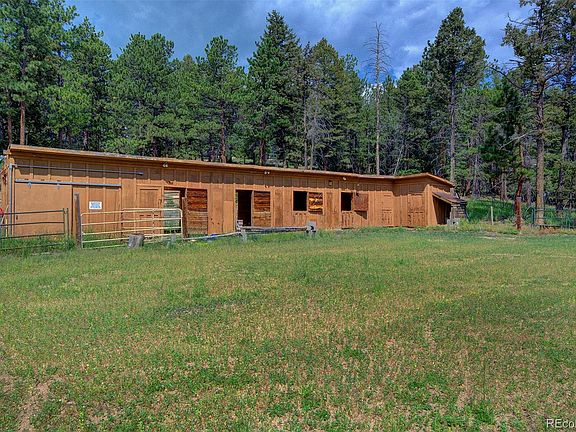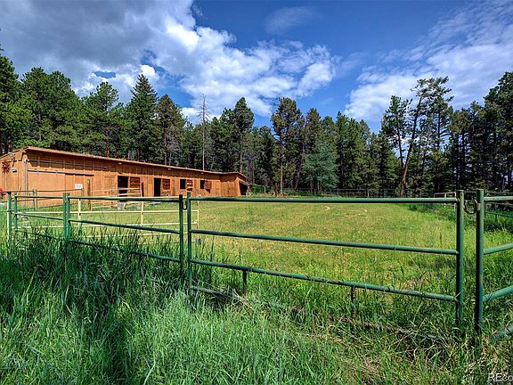 Ride to Trails! Here's your Opportunity to buy in Conifer's Piano Meadows. Flat, usable 2.3 acre, a 6 Stall Barn with Riding Arena (10m x 20m), and a Huge Barn. The Barn includes (2) adjoining Stalls that can be separated to create a larger Foaling/Hay Storage Stall. Includes Stud Stall, Lighted Grainery, and Heated Tack Room with Electricity throughout the Stalls and a Heater in the Double Stall. The Stalls open to the back to a drylot area. Located on a publicly maintained road, the home is set back on wooded property with large, Asphalt loop driveway. Grand 657sqft (approx), south-facing, Fiberon deck provides ample exterior entertainment area and has (6) electrical outlets. Sunny open Kitchen features soft-close cabinets, large island, and bay window overlooking deck, connects with large family room with wood-burning stove. Upper level, spacious Primary Bedroom has ensuite Full Bathroom with CastIron Clawfoot tub, which stays heated for hours! , walk in closet, and additional space currently used as an Office. Additional Full Bathroom and Bedroom complete Upstairs living space. Lower Level includes Large Family Room with Built-in Bookcases & Walkout, Full Bathroom, Non-conforming Bedroom with closet, and generous Laundry Room. The Oversized, detached Garage has space for two vehicles, and includes workbench. (4) Zone Energy Efficient Boiler installed 03/2022 and Electrical Panel installed 2020. Deck Furniture- gray lounge furniture and table/chairs, Playground and Shed included. The Well Permit is for Household Use Only. Septic size is unknown.