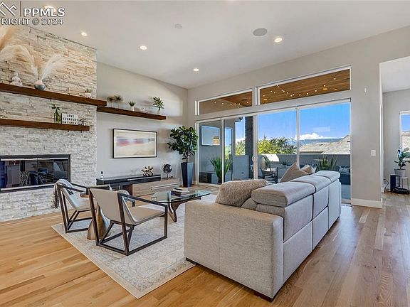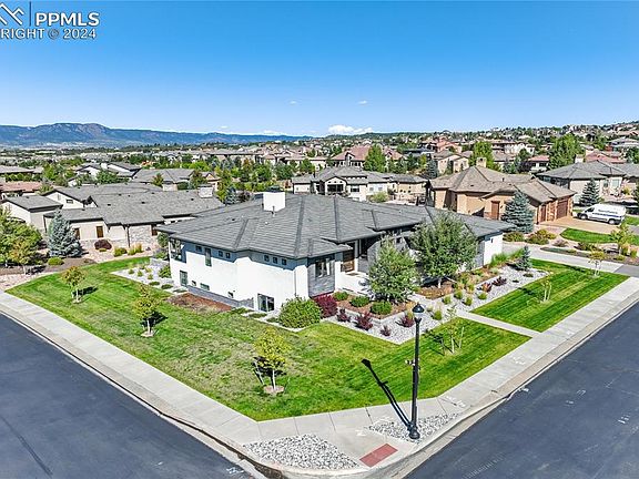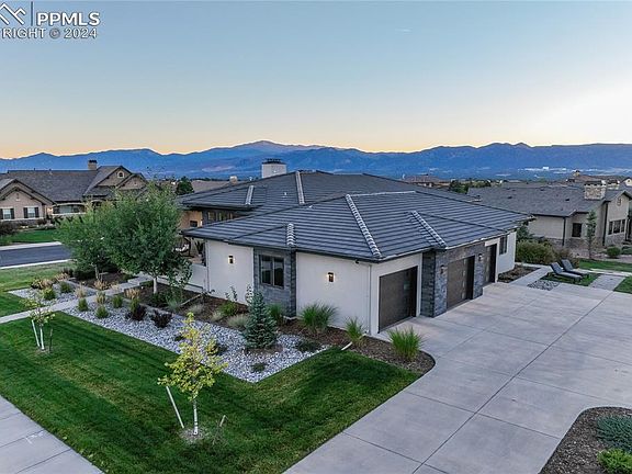 Luxury living in the gated Calistoga Village in Flying Horse. Custom-built modern home on nearly ½ acre lot, offering awe-inspiring views of Pikes Peak. When you step inside, you'll be captivated by the impressive level of craftsmanship & attn to details. Loaded w/over $ in the latest home tech; Control4home automation, hi-fi Monitor Audio spkrs, distributed video, automated window coverings, lighting, smart locks, & security system. Great rm w/12’ ceilings, lvl 5 drywall finish, flr-to-ceiling stacked stone FP w/floating wood shelves, white oak hardwd flrs & wall of glass create an ambiance of sophistication. The sleek kitchen has views of Pikes Peak, Arizona Cypress wood panelized cabinets, hidden pantry, Wolf gas range, dble ovens, quartz island w/brkfst bar, Miele dishwsh, subzero fridge & separate freezer drawers, designer lighting, prep sink, & bev center w/built-in fridge. Walk-thru pantry has quartz counters, coffee station, work desk, & access to garage. sliding glass drs open to covered patio w/stucco privacy wall, built-in BBQ, tongue & groove ceiling. Main lvl office has bookshelves w/steel sliding ladder. The luxurious primary suite has walk thru closet, pendant lighting, & captures great mntn views. 5pc primary bath offers heated tile flr, floating vanities, a soaking tub & standalone shower w/bench. Precision engineered steel & wood staircase w/LED lighting leads you to the finished bsmnt. Open family rm w/ 7.1 Hi-Fi home theater w/projector, SI slate screen, & full bar. Wet bar w/waterfall edge counter, ice maker, & wine fridge. Purpose-built cigar rm w/exhaust fan. 2 lower lvl beds w/walk-in closets share a jack & jill full bath, while the 3rd has a built-in bunk bed. 3/4 hall bath boasts a urinal & river rock shower flr. Completing the lwr lvl is a hidden safe rm, workout rm, craft rm, & multiple storage areas. Garage w/ poly flr, speakers, insulated drs, storage cabinets. Main lvl laundry/mud rm w/sink & cabinets, too many upgrades to list