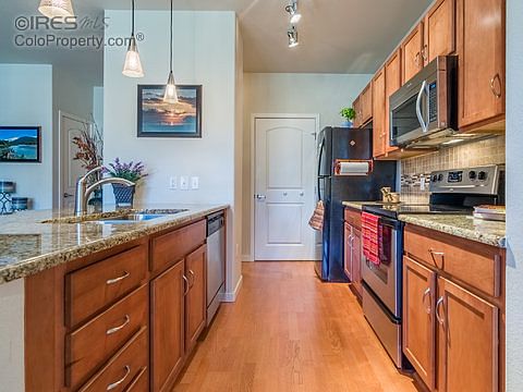 Views of the Flatirons greet you as you step onto the deck of this pristine & bright condo.This former model has barely been lived in & you'll truly appreciate & enjoy features like two master bdrms, huge upgraded granite island, pull-out shelves,custom shelving in closets. All appliances are practically new & stay. Reserved underground parking spot incl lockable storage unit.Move right in & start your new relaxed lifestyle in this fantastic community with clubhouse, pool, and exercise facility.