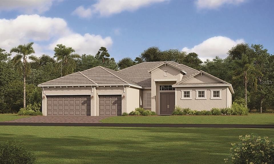 Under Construction. The three bedroom, three bathroom Sunset estate home delivers an airy, open floor plan ideal for entertaining. Enter through a formal foyer into an expansive great room with glass sliders leading to the spacious lanai. The kitchen with large island is every cook’s dream and marries the living space and formal dining room. This split-plan features an owner's suite retreat with two walk-in closets, dual sinks, standing shower and private entry to the lanai. On the other end of the home, an additional two bedrooms each boast their own full bath and ample storage. The home is complete with a cozy den, ideal for the home office or library. At 2,650-square-feet, The Sunset is the perfect place to grow your family. Rendering, pictures and virtual tour are of model and are used for display purposes only. Estimated delivery August/September 2022.