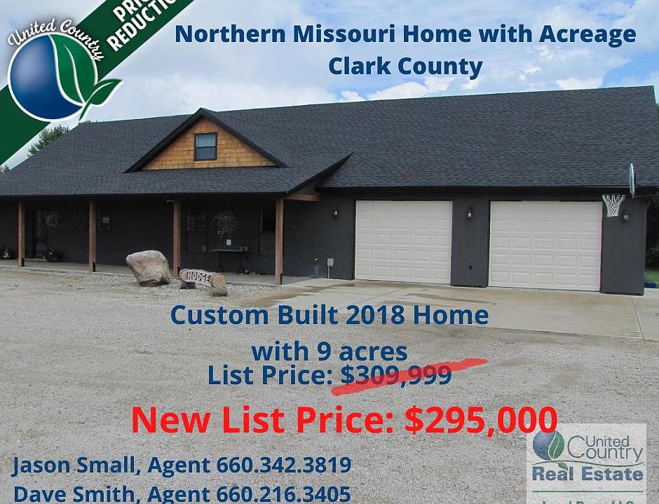 Northern Missouri home with acreage, located in Clark County. This is a beautiful secluded custom home built in 2018, it features 5 bed, 3 baths, with 3216ft of living space on nine acres. The home sits on a slab with a spacious two-car garage that includes a storm room built into the garage floor. The home is highlighted by custom cabinetry and an open floor plan with vaulted ceilings. There's a gorgeous master suite with a huge master bath that has a large jet tube and custom shower. For the handyman or for a small business there is a shop 30x70 shop that is partially heated