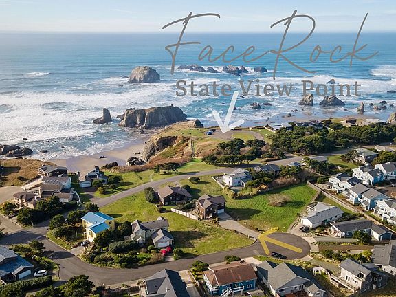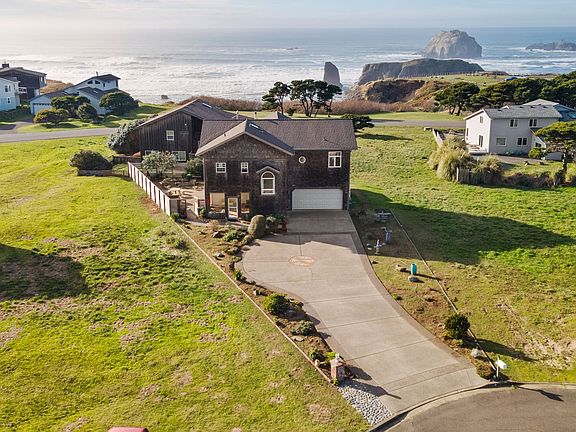 Experience the allure of coastal living in this custom-built two-story home, perfectly situated in a quiet cul-de-sac neighborhood proximity to Face Rock beach access, home of Circle in the Sand. Built in 1995 & completely remodeled, this move-in ready 3BD/2BA, 1,836-square-foot contemporary home offers modern amenities & stunning ocean views. Step inside through a spacious, light-filled sunroom w/tiled floor, creating an inviting atmosphere & seamlessly blending indoor & outdoor living. The lower level features a large entryway, two bedrooms (one with backyard access), a dedicated laundry area, and stylish guest bathroom w/heated electric floors. The home's reverse-living design maximizes the breathtaking views, w/primary living areas on the upper floor. Ascend the elegant spiral staircase to an open-concept space highlighted by beautiful oak wood flooring & newly installed windows in the living room & kitchen area. The living room impresses w/its floor-to-ceiling fireplace & 18-foot ceilings. A well-equipped kitchen boasts a large, leathered granite countertop island for casual eating, while the adjacent dining area features built-in cabinetry, ocean-facing deck access designed for easy entertaining & al fresco dining. Primary bedroom offers deck access, a walk-in closet, & a luxurious en suite bathroom w/heated floor, deep soaking tub, walk-in shower, & marble double sinks on a granite countertop. This home is equipped w/a central vacuum system & electric zone heating in each room. The 40-year roof was replaced in 2015. Two-car garage features a 220V outlet for car charging, while the spacious driveway accommodates multiple vehicles. Cedar-fenced backyard is beautifully landscaped w/ charming side yard brick patio. For gardening enthusiasts, yard drip system, there's a 10x10 ft greenhouse w/concrete foundation, brick overlay & electric potential. Minutes from Bandon's charming Old Town, explore nearby beaches, renowned golf courses & endless outdoor activities.