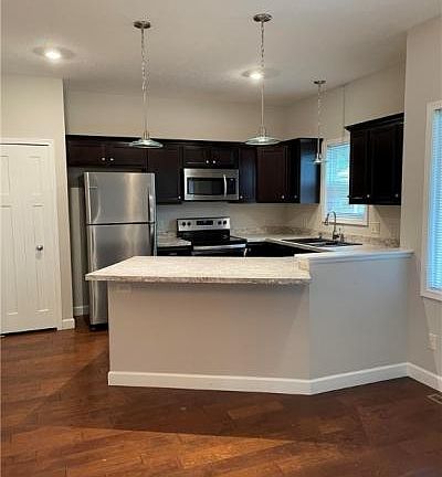 Newer Townhouse style condo. Overlooks a picturesque pond. Spacious main floor with entry foyer, kitchen with great work space, natural light and stainless appliances. Casual dining with barstools and a dinette area. Large great room with fireplace. Wood flooring on the main floor. Half Bath. The upper floor offers three bedrooms and two full baths. Convenient bedroom level laundry room. Large master has an 8X7 walk in closet. Master bath with double sinks and granite countertop. Also a full size double closet for linens and storage. 12X14 second bedroom with a walk in closet. Third bedroom could be a perfect work at home office. 12X14. Full Basement. Two car garage. Located in the The Fountains, a gated area of upscale condominium homes. An added bonus is the ability to access a dock on Meyers Lake with a Dock Fee. Units in Fountains II dont have access to the community buildings.