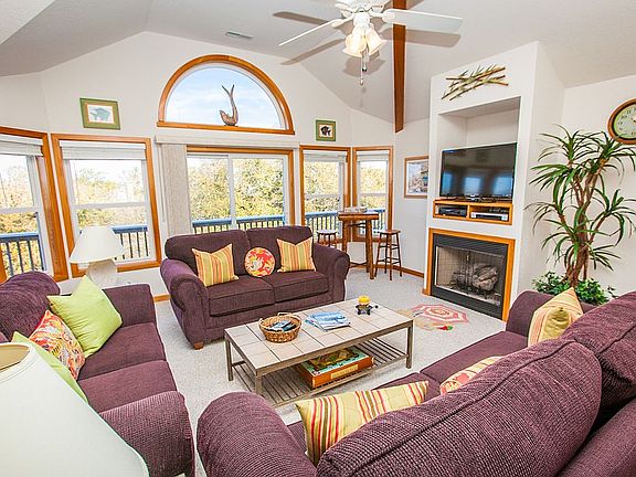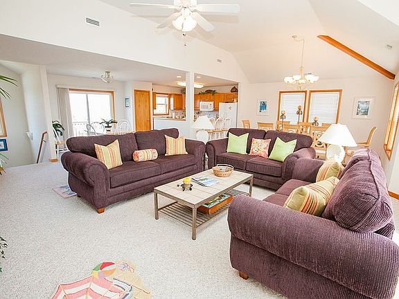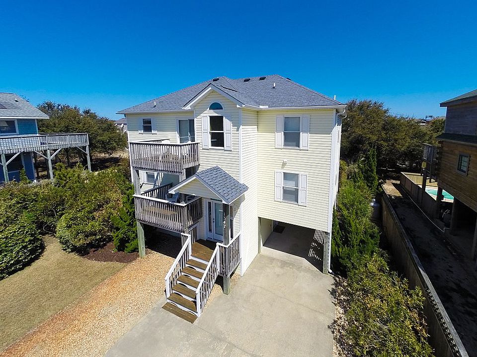 Here is the ONE you've been waiting on!! THIS HOME HAS IT ALL AND MORE!!! This home is gently used and truly loved by the current owners as you can see by it's condition and upgrades. Used mainly on weekends and in season with family this home is immaculate and extremely well maintained. Step inside to the lower level where you find the 2008 Soluri addition of a full bath with a custom tile shower, granite wet bar with all the amenities, a game room and sitting room fully equipped with a BOSE Surround Sound system. Easy access to the pool deck, private pool and hot tub with another surround sound system with BOSE speakers. Head upstairs to the mid level with two queen masters and two bunk rooms (both with tri-pod beds) that share a hall bath (attached to one of the bunk rooms). Mid level also houses the washer and dryer for ease of use. The three bedrooms on the back side of the home all have access to the covered deck overlooking the pool and the front bunkroom has a private deck overlooking the sound. Up one more flight of stairs to the huge OPEN and AIRY floorplan. This floor will make your heart smile! With it's sound views and bright blue skies you walk into the living room with its large comfy couches and gas fireplace for those chilly evenings. A small breakfast nook allows for coffee and donuts overlooking the sound as well as the front deck for sound breezes. A fully appointed corner kitchen with an elevated bar and stools to eat or converse is open to the entire floor. A full size dining room sits on the back side of the home overlooking the upper sun deck. Comfortable eating seating for 18 to enjoy large family gatherings! A powder room sits off the living room for ease of use. The King Master (5th bedroom) flanks the living room and offers it's own private bath and shares the back deck. This home is tastefully decorated and MOVE IN READY! Sitting on the north side of Duck you are still a bike ride away from town, restaurants and shoppi