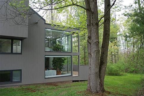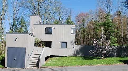 Beautiful contemporary home designed by award-winning architect. Set back on secluded wooded 2.3-acre lot, just over 3 miles from Cornell. Lovely light in all seasons from dramatic two-story windows and 16' skylight. Free-flowing floor plan is ideal for entertaining: formal dining, airy double living room, and bright kitchen opening onto huge deck. New bamboo floors throughout upstairs. A rare and extraordinary home for people who appreciate both elegant design and great function. Second-floor laundry, built-ins throughout, fenced yard, dog run off mudroom, and oversized 3-car garage.