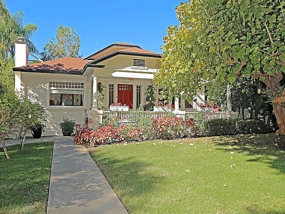 Prepare to fall in Love with this charming Spaulding Square California Bungalow built in 1919. Full of charm & character, this vintage gem sits on a huge 7,550 lot. Inviting front porch & large front yard welcome you instantly. Bright & cheerful Living room w/ wood burning fireplace. Original hardwood floors throughout. Dining room w/ original built-ins & buffet. Large kitchen w/ carrera marble counter tops, custom period cabinets & huge laundry room/pantry. Front bedroom has vaulted ceilings & loft w/ French Doors that open to private side patio. Primary bedroom w/ensuite bathroom. 3rd bedroom has French doors that open to a beautiful entertainer's backyard w/ salt water pool, lush professionally landscaped yard, & outdoor dining area w/ pergola. Garage was tastefully converted to guest cottage/office (approx. 300 sq. feet) with bathroom & shower.
