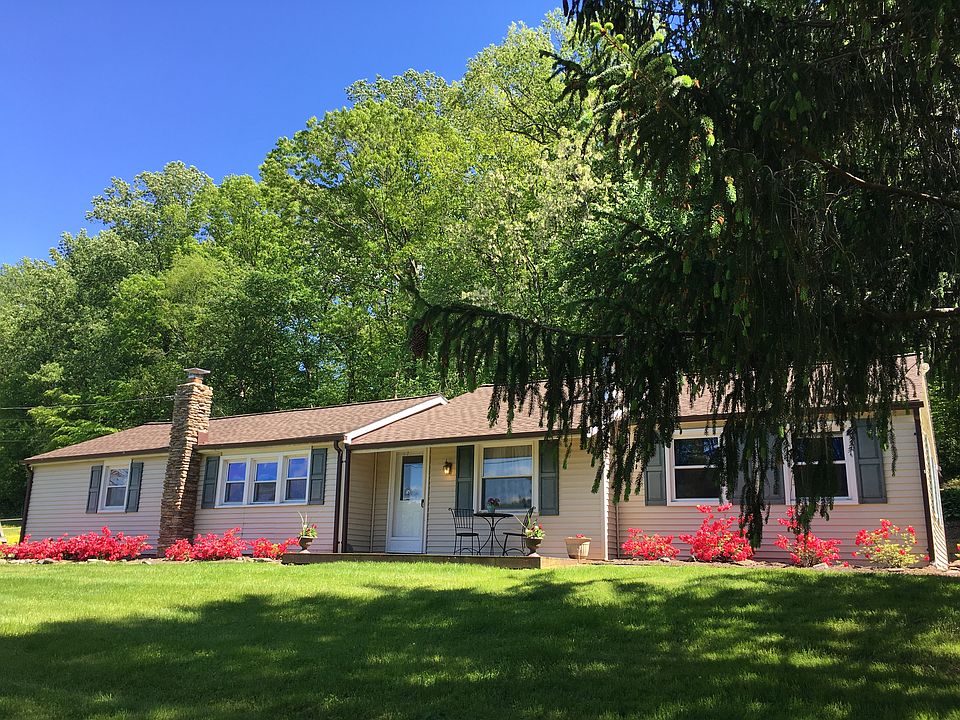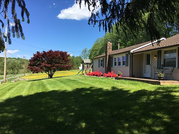 Good Country Living! Very Comfortable Rancher, Great Views! Huge Eat-In Kitchen, Granite Counters, Sliders to Large Ground Level Deck Surrounded by Beautiful Gardens, 2.57 Acres, 2 Stall Barn and Large Fenced Pasture. Large Exterior Shed "As-Is", Chicken Coup. Recent Roof! Wood Stove in Living Room Can Heat Whole House! Shows Well! (Swingset Excluded)