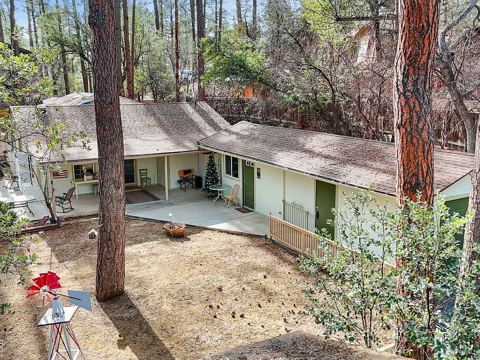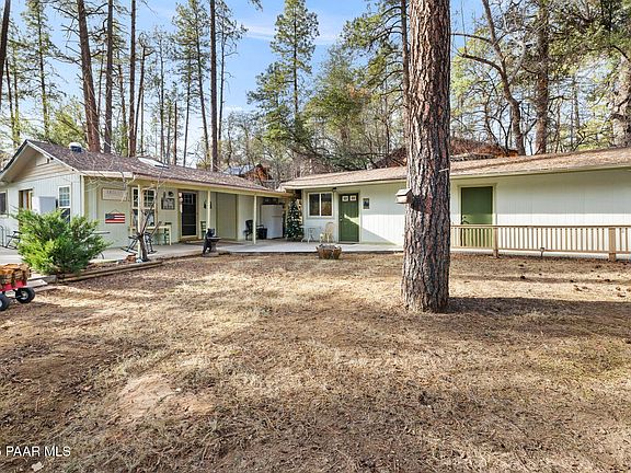 Welcome to 1347 W Quartz Rd, a beautifully situated Prescott property that blends comfortable living, income potential, and unmatched privacy just minutes from historic downtown! Tucked into the serene pines of Ponderosa Park at the end of a quiet, paved road, this unique offering presents a rare opportunity to own a peaceful retreat with multiple living spaces and versatile options for income. The main home features 2 bedrooms and 2.5 bathrooms with a functional layout designed for everyday living. Both the main home and the guest studio are equipped with energy-efficient mini-split systems, providing independent heating and cooling for year-round comfort. Outdoor space includes an oversized patio area and a seasonal creek running along one side of the property. A studio guest home is attached to the garage/workshop, creating a flexible second living space ideal for rental income, guests, extended family, or a home office. The property also features a garage/workshop area and a covered 2-car carport, offering space for vehicles, storage, or hobby use. Mature pines surround the property, enhancing privacy and creating a quiet setting with easy access to Prescott National Forest trails and amenities, while not being too far from the downtown area. This property offers a unique opportunity for an owner-occupant seeking supplemental income or a buyer looking for flexible living arrangements in a desirable Prescott location.