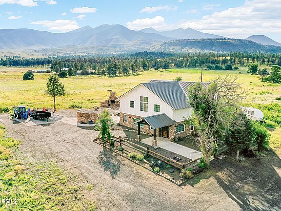 HOME WAS SOLD WITH 10 ACRE SPLIT ONLY (so price lowered accordingly). This gorgeous remodeled farmhouse includes an easement to the National Forest. Panoramic views of the San Francisco Peaks! Currently vacation rental business that buyer can take over; complete w/ branding, website and upcoming rental income. Beautiful outdoor stone gas fireplace & entertainment area. All furnishings/furniture/antiques in & on property included + tractor. Property is zoned AR-5 and allows for horses & other animals subject to county provisions. Potential to add another building/barn for weddings/events but buyer to verify permitted uses with county. Vacation rental calendar & income details available at request.
