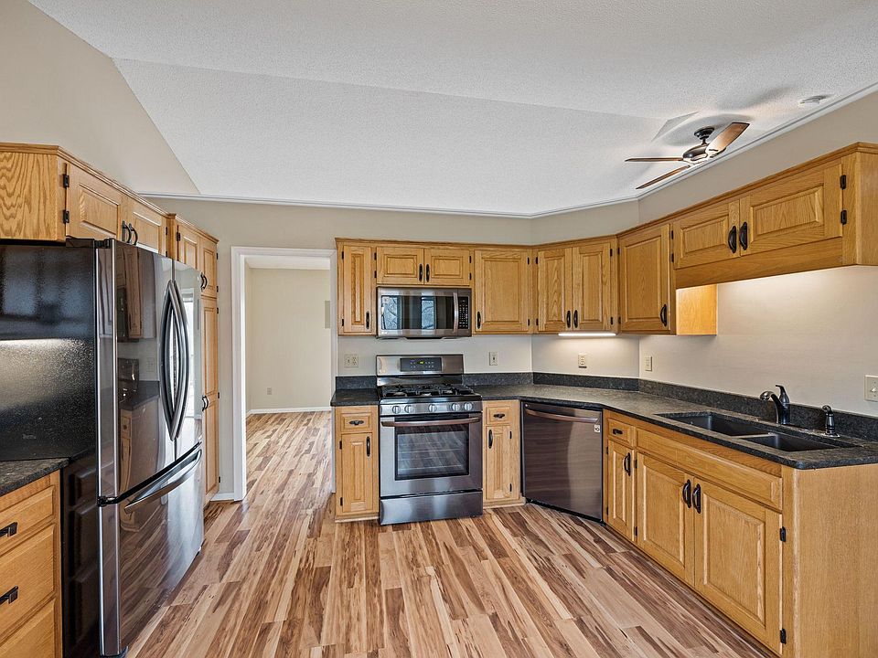 Welcome to a spacious home on a roomy lot in a fantastic location. Step in from a covered entry and into foyer with a large entry closet. Cook in a sizeable kitchen, updated with stainless steel appliances, tons of counter space with an eat-in breakfast area. Relax in the upper-level living room w/ plenty of natural light. Sleep in a generously-sized primary bedroom w/ walk-in closet and pass-thru door to the upper-level full bathroom. Unwind or entertain in the lower level family room with a wood panel accent wall - with natural light flowing in from Southern and Western patio door and windows. This level also has access to the garage and laundry in adjacent closet. The finished basement level has 2 spacious bedrooms with generous closet space and look out windows. A new water heater May 2023. The backyard offers a perfect sun shade mix for enjoying the outdoors at anytime of year. Backyard abuts up to Kerber Park in the heart of Maple Grove!