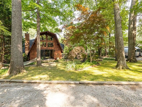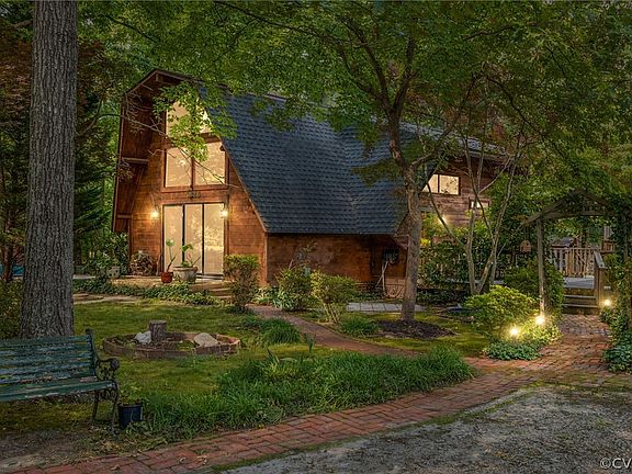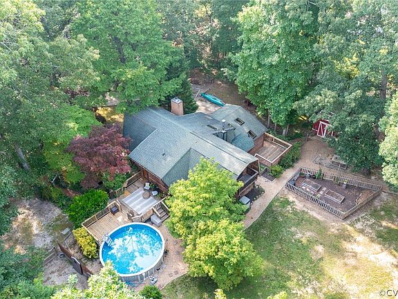 Fall in love with this picturesque mini-farm just 30 minutes from Richmond City! This stunning 3 bed, 2 bath, well designed log cabin and acre property offer a peaceful retreat. The beautifully landscaped outdoor space has an above ground pool, fully fenced backyard, chicken coop, duck area, room for a horse with a separately fenced paddock and barn (with tack room), custom built A-frame treehouse with swingset, separately fenced raised bed garden area, and multiple storage barns/workshops spaces. The log home is charming, warm, and integrates seamlessly into this amazing setting. Plenty of relaxing places for morning coffee...multiple decks, a bright sunroom, benches in the mossy front yard, or even the balcony off of the primary suite. The inside of the home is picture perfect with a two story family room with a fireplace and large windows that bring the nature in. The kitchen has beautiful new quartzite counters and opens up to a dining area and walk through pantry. There's even a pass through above the sink to the window filled sunroom with skylights. The first floor is complete with great closet space, separate laundry room, two bedrooms, and a full bath. Upstairs you will find a cozy loft area that overlooks the downstairs living room...perfect for an office or den. The large primary bedroom has a walk in closet, full bath with over sized garden tub, and charming balcony overlooking the rear yard. There's a large driveway with plenty of space and parking so bring your camper and canoes. Zoned agricultural and ready for a new owner and their animal friends!