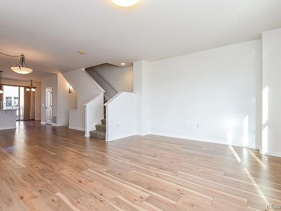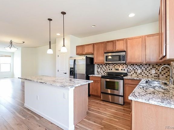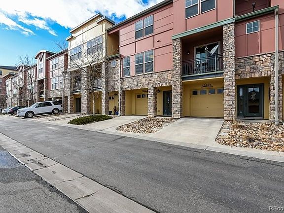 This Broomfield townhome offers an open concept floorplan, a kitchen island, granite kitchen countertops, stainless steel kitchen appliances, a master bath separate tub and shower with dual sinks, a master bedroom walk-in closet, a balcony, and a two-car garage.