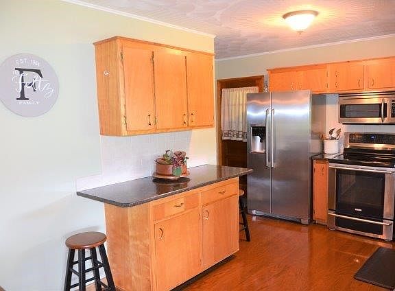 ENTHRALLING RANCH HOME tucked away on 4.10 acres of privacy & breath taking views! Entertaining will be a breeze w/the combined kitchen & dinning, tastefully upgraded w/oak cabinets, granite counters & SS appliances.Gleaming hardwood floors & 2 beautiful stone casings surround a fireplace & pellet stove make this home pop w/warmth. Basement holds of a 2nd full kitchen,full bath & family room-perfect for home office, multi-generational opportunity, or homeschooling area w/privacy. Relaxing back porch overlooks a 2 story barn, yard w/fruit trees &mountains. Own your own PRIVATE COUNTRY PARADISE!