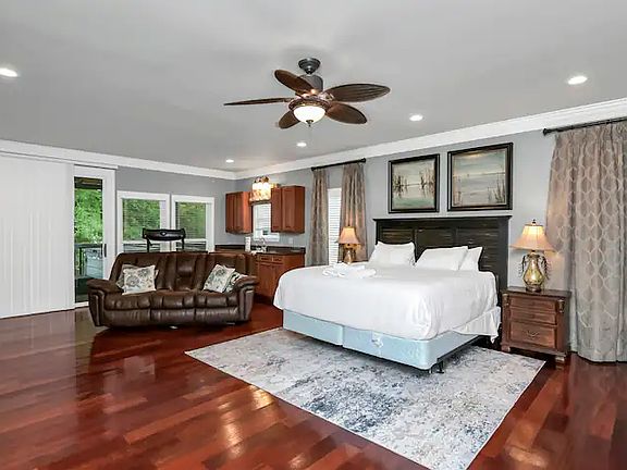 Newly listed winter snowbird special, this property features 6 Bedrooms, 6 Baths & 3 Kitchens, spanning almost 4,000 sq ft. Bring the entire family, this home includes the studio apt over the detached garage with those sought after big water views from all 3 Living Areas. This home encompasses three separate living areas in total. Studio apartment has 1 bedroom, 2 baths, and a game room. The Master Suite in the main home features a large whirlpool and huge walk In closet/dressing area, its own kitchen and living space. The dock has electricity & water. Rent this home for the winter and enjoy the holidays here! Make It Yours Today! This is a must see Owner pays for water, bug control, and cable. Renter pays utilities, home is fully furnished.