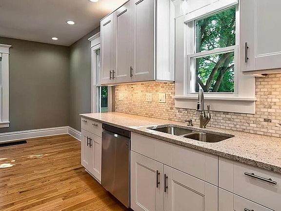 Large entry foyerHistoric period trimQuartz countersBrick fireplaceDining areaPocket doorsLarge shade tree