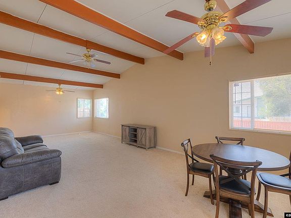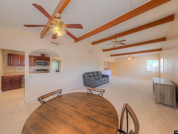 Cozy Stead home with high ceilings and wonderful natural light. The upgraded kitchen with warm colors and stainless steel sink, newer stainless steel range/oven has solid surface counters and tile back splash, flooring. Spacious living/dining area with wood-beamed ceiling and ceiling fan gives a stylish look to this open floor plan. Fully fenced and plenty of room for RV parking and all the toys. Large clean lot and ready for a new owner.