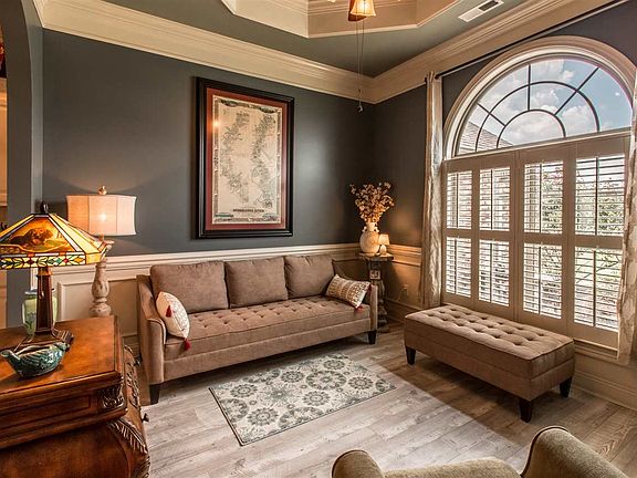 - LIVING ROOM DESC: Crown Mold, Smooth Ceiling, Window Cov, Laminate Floor, 10? + Ceiling, Trey