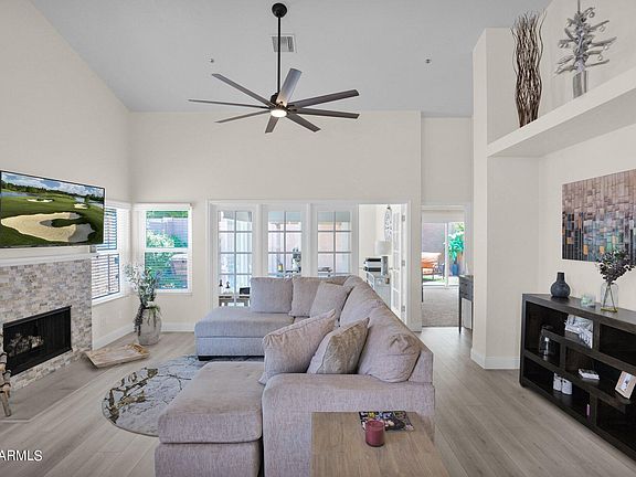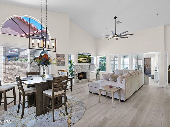 This outstanding and highly desirable Scottsdale single level home offers two bedrooms, 2 baths and a den/office. The inviting open floor plan features a spacious family room with cozy fire place and vaulted ceilings for an open and airy feeling. The light and bright kitchen offers white cabinets and stainless appliances. A large bonus room is a great addition that can be used as an office or flex space with 2 large sliders to the wrap around patio. The master retreat has a slider for direct access to the tranquil backyard and offers an ensuite bathroom with dual sinks, walk-in closet, skylight and updated walk-in shower. The split floor plan features a spacious secondary bedroom and bath affording guest privacy. There is also a convenient separate large laundry room. The pavered back patio has plenty of space for relaxing and entertaining guests in the inviting shaded or sunlit areas. The home is close to a sparkling community pool and spa. Great Scottsdale location just minutes from shopping, restaurants and services. Low HOA dues include exterior painting just completed in May24 and front yard landscape. Minimum 30-day rentals allowed. Perfect full, part-time or investment home. Furniture is also available for sale. The Square footage is actually 1331. New Roof 2019, HVAC 2018, Updated LVL 2021. Windows and all Sliders