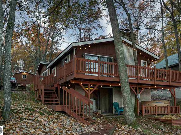 Year round cottage on the beautiful shores of Little Bear Lake. Clear, sandy bottom private all-sports 126 acre lake. Great for waterskiing, wakeboarding, swimming, fishing. 1,650 square foot home plus a 24'x24' two story garage and 625 square foot bunk-house/recreation room/extra sleeping area. Absolutely stunning views. 3 bedrooms upstairs and one large 'family suite' on walk-out lower level (has sleeping for 10 in beds in the main house). Great lawn and sandy beach. Area has many activities for all seasons. For golfers, 15 minutes to Garland or Treetops. For snow skiers, 15 minutes to Treetops and 40 minutes to Boyne Mountain. For water sports, every lake activity on your own beach. For snowmobilers, 100's of miles of trails from your back door on State land. This place has something for everyone. Only 3 hours from metro Detroit. 15 minutes from I-75 Waters exit #270.