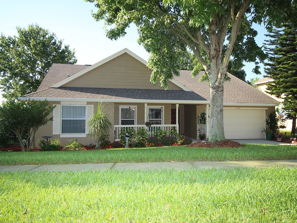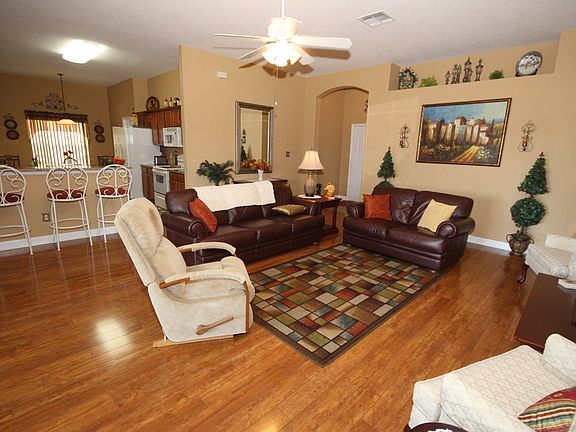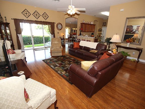 Stunning home in Errol Vista Estate. Large corner lot with lush grass landscaping and mature trees. Open entry with foyer opening to large open floorplan. Upgraded laminate flooring throughout home. Kitchen opens to the living space. All appliances stay in the home. Closet pantry and eat in dining. Separate formal dining room off the kitchen. Large utility room for laundry and storage. Spacious master bedroom. Master bathroom has a walk in shower and separate tub. 2 bedrooms separate from master. Step out the back slider door to a covered screened in patio with a pond view. Enjoy a glass of iced tea in this the peaceful, serene space. Pride of ownership in this home. Home is immaculate. It will not last long. Make an appointment today!