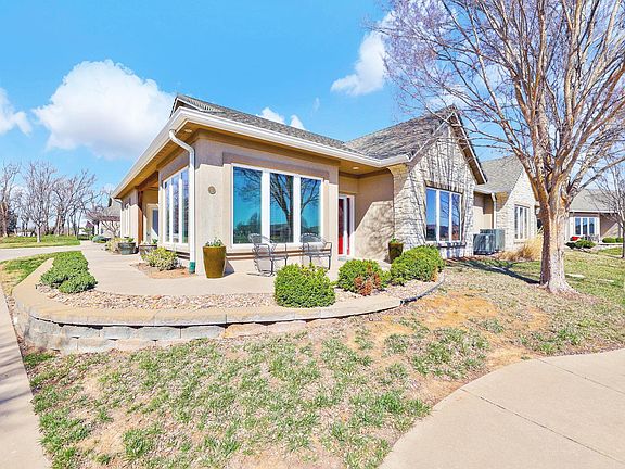 One of the largest (2004 sq ft) Patio homes in the Hamilton Estates Addition of Derby! This ICF Constructed Ranch-style home features 3 bedrooms and 3 full baths with a light-filled Sunroom that overlooks the two stocked ponds with a nice walking path for your evening strolls! The finishes that you will find in this home exceed most builders standards. Beautiful extra wide trim and crown molding that highlights the 11 foot ceilings compete with unique hidden lighting. You'll love the large spacious rooms for entertaining and family gatherings. The wonderful "Cook's Kitchen" has abundant counterspace, tons of cabinets and pantry for storage, and a handy bar/island complete with electric cooktop, pot-filler bar sink w/disposal, and all appliances including a brand-new Refrigerator will stay! The separate laundry room includes both the washer & dryer and doubles as a storm shelter! This split-bedroom floorplan with large Master Bedroom Suite has access to a covered south patio that's perfect for your morning coffee, a huge walk-in shower, large double sink vanity, and walk-in closet! There is a second bedroom in the front of the home with a large walk-in closet, private bath with a tub/shower combo, and a nice view of the pond! The third bedroom and full-size hall bath is located off the kitchen and works great for a private guest area or your home office! Updates include a new roof, new sun tunnels, and a new heat pump. You'll enjoy the radiant floor heat thru-out that makes this home so comfortable in the winter months. For maintenance-free living this Patio Home Community includes lawn sprinklers, mowing/trimming, exterior insurance and maintenance, snow removal, upkeep of the common grounds, and the best neighbors ever! NO Special Taxes! Check out the pictures and virtual tour and call for your private showing soon!