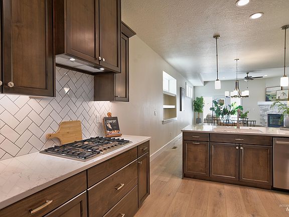 Carmel Cottage by Ted Mason Signature Homes. Low maintenance single level home with exceptional craftsmanship throughout. Quality designer finishes. Featuring three bedrooms plus additional large office/flex room. Kitchen with custom wood cabinets, quartz counters/full tiled backsplash, Bosch appliances and built-in display shelves open to spacious dining and relaxing great room with gas fireplace and 10ft. ceilings. Primary suite & ensuite features tile flooring, quartz counters, no step walk-in full tiled shower & large walk-in closet. Blinds included, separate mud room + utility room, Two covered patios. Oversized 3 car garage w/200 AMP service in garage for electric vehicles. Nestled in the heartbeat of downtown Meridian this charming community of single level modern New England cottage style homes will capture your heart. Cherry Blossom features a gathering area w/gazebo, firepit & built-in BBQ. Front & rear landscape maintenance included w/HOA dues. Convenient downtown access.