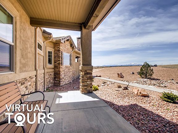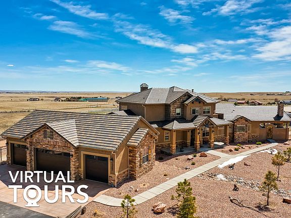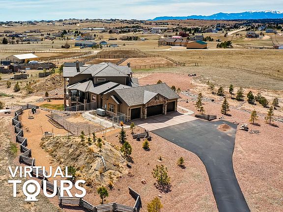 Traditional showings are still welcome! Buyers can view home in person while practicing social distancing. Or join a live video call with an agent and walk through the home. SPECTACULAR LUXURY ESTATE with 6 bedrooms, 6 baths, and 8,257 square feet in desirable Black Forest area close to Peyton, CO and a short drive to Colorado Springs. This sprawling home is perched atop an elevated lot with nearly 12 acres of land and boasts magnificent 360-degree views. Loaded with upgrades, designer finishes, and plenty of space for outbuildings and horses! Low maintenance exterior with stone, stucco and high-end concrete roof with many unique architectural accents that frame the exterior beautifully. A winding asphalt driveway leads to the 4-car finished, insulated, and heated garage that is accessed from both the main level and basement. Huge great room with towering cathedral ceilings, open to the catwalk above, rich hardwood floors, and a prominent double-sided gas fireplace with floor-to-ceiling stone surround. No steps on main level and wide hallways to accommodate handicapped if needed. The gourmet kitchen features beautiful porcelain tile flooring, granite countertops, large sit-at center island, separate pantry, abundance of cabinet space, and has stainless steel appliances including double ovens. Main-floor primary and guest suite, stone wall accents throughout, all granite counters, custom bathroom sinks, 6 fireplaces, knotty alder cabinetry, trim and over-sized doors. The primary suite is a true retreat with a double-sided fireplace with stone surround, crown moldings, separate sitting room, and access to a private courtyard with wood-burning fireplace and hot tub. The spa-like en-suite includes a 5-piece bath with large walk-in shower, separate soaking tub, and a huge walk-in closet with built-in storage. The home also features 2 offices - one on the main level and one upstairs with balcony and fireplace. If that's not enough, the outside space is truly exceptional! The main floor features an extra-large covered composite deck with stone pillars, gas fireplace, and great views to the east. Finished walkout basement with game room, family room, 2 bedrooms, gym, hobby room, and tons of extra storage. An incredibly special home with so much to offer!