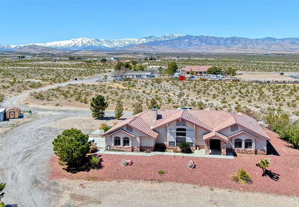 With over 4 acres of land, a 1190 sf 3 car garage, & an enormous 2800 sf detached 5 car & RV garage, there is plenty of space for all your vehicles & storage needs. The home itself has a huge living room w/ lots of windows, allowing for plenty of natural light & beautiful views of the surrounding mountains. The kitchen and dining room are both spacious and feature granite counters, beautiful wood cabinets and tile flooring. The primary suite is very large & includes a luxurious bath with a steam shower & separate jetted tub. Additionally, the RV garage includes a workshop, office and 3/4 bath, making it a perfect space for all kinds of projects. The property is also zoned for horses, so if you're an equestrian enthusiast, you'll have plenty of room.The location, just off the road on Kyle Canyon, provides easy access to amenities while still offering privacy and seclusion.
