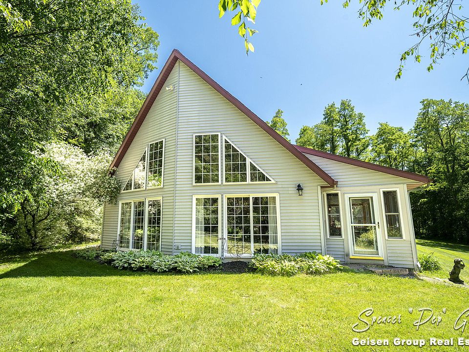 PRICE IMPROVED on this 3 bedroom, 2 bath, 1997 Chalet offering 2,148 sq' and setting on a pleasant and partially wooded 12.18 acres west of Greenville. Many features will be enjoyed including the great room facing north with large view of the acreage to the north, peaceful 3 season enclosed porch facing the western skies and overlooking the private pond with various wildlife, 24x24 main floor family room with fireplace, the entire main level with the exception of the family room has in floor radiant heat, 3 mini splits for AC, a 22x24 attached garage plus a 42x30 heated stick built garage with a separate 14x20 workshop/storage, private dog run and fenced yard area off garage. Natural gas just connected in March 2024! Possession may be negotiable. A great place for you to call HOME!!