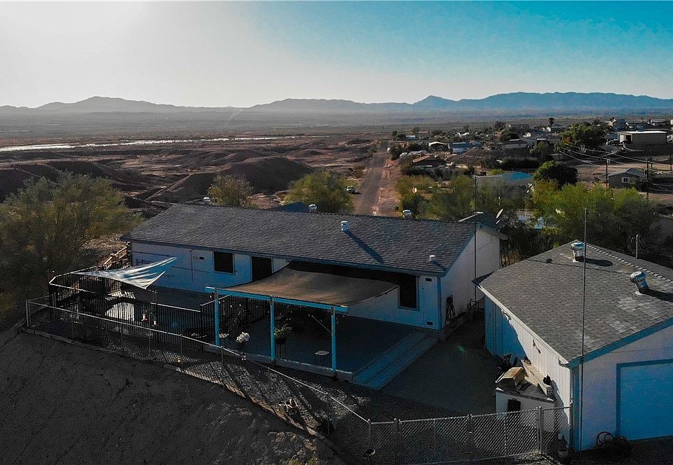 Nestled atop a tranquil hill in the heart of Topock, AZ, this 2-bedroom, 2-bathroom home is the desert haven you've longed for. Spread across two expansive lots, totaling 1+ acres of prime real estate, this residence offers the ultimate in privacy and serenity. Located within the coveted Golden Shores community, it enjoys a prime position as a perimeter lot, ensuring a feeling of boundless freedom and seclusion. As you approach the property, you'll be immediately entranced by the amount of space to store your toys and the breathtaking, unobstructed views of the glistening river below. Nature becomes your closest neighbor, as the home backs up to the vast expanse of BLM land. Standing on the expansive deck, you can savor your morning coffee or stargaze at night, feeling as though you've escaped to your private retreat far from the hustle of city life. The interior of this charming abode is equally alluring. The homes floorplan is well designed, and the living area creates an inviting atmosphere for both cozy evenings and lively gatherings with friends. With both formal and informal dining space plus an additional study/den, there is plenty of space in this wonderful home. The connected outdoor deck makes for a perfect setting for al fresco dining and relaxation. What's more, this property boasts a private pool (8'x24') with an outdoor shower that offers the ideal place to cool off & soak in the sun's rays. A detached 2-car garage + carport capable of comfortably accommodating 2 cars, boats, or RVs ensure that all your prized possessions have a secure and covered home. The property is partially fenced around the home, with additional fencing for the pool area, providing peace of mind and a safe haven for family and friends. There is also a 22kw gas generator with auto-start for your peace of mind. For outdoor enthusiasts, this home is a gateway to endless adventure. Hiking, off-roading, boating, and fishing are at your doorstep. The Golden Shores community has a private clubhouse and is a close-knit neighborhood of fellow outdoor enthusiasts who share your passion for the great outdoors. Don't let this opportunity slip away - own your very own slice of desert paradise where seclusion and stunning vistas are your daily reality. Embrace the tranquility and unspoiled beauty of Topock in this outstanding hillside escape.