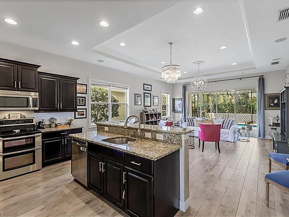Discover your ideal home nestled within the desirable community of Manchester Square. This single-family residence boasts a refreshing pool and offers a seamless blend of elegance and comfort. Built in 2012, the residence features a desirable open floor plan with 3 bedrooms and a den, providing ample space for modern living. Step inside to find an array of desirable features, including diagonally laid tile flooring in the living areas, a custom kitchen adorned with raised wood panel cabinetry, and luxurious granite countertops. The kitchen also showcases a stylish stone and glass tile backsplash, stainless steel appliances, including a French door refrigerator and range with cooktop and dual ovens. Illuminating both the workspace and ambiance, you'll appreciate the under and over cabinet lighting. Entertain effortlessly in the spacious great room, enhanced by surround sound that extends seamlessly onto the lanai, perfect for poolside relaxation. French doors lead to the den, while tray ceilings with crown molding and premium fixtures throughout. Situated on a desirable oversized corner lot, this residence offers a generous side yard, ideal for pets or children. Residents of this gated North Naples community enjoy access to amenities such as a community pool, fitness room, basketball court, and clubhouse available for private gatherings, all with low maintenance fees.