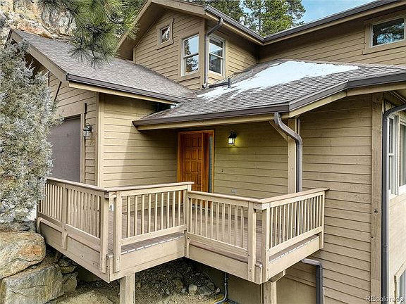 This sunny mountain sanctuary sits quietly at the end of a cul-de-sac and backs to 1087 acre Bergen Peak State Wildlife Area. You’ll enjoy miles of southern mountain views from every room and beautiful rock outcroppings to the east. On the main level vaulted ceilings and a wall of south-facing windows allow for an abundance of radiant heat and natural light to fill the open great room, kitchen and dining room. Also on the main level is a sunny office situated off the main entrance and a ½ bathroom to accommodate the main living areas. A charming patio surrounded by rock outcroppings sits off the dining room and wraps around to the southeast corner of the house. Privately located by itself on the upper level the spacious primary suite contains an updated bathroom, his/hers walk-in closets and a laundry chute. In the walk-out basement there are 2 bedrooms located on either side of the family room. The family room has built-in shelving and a bar with a sink and small fridge. The deck off the family room provides a magical space to take in the starry nights or watch sunrises and sunsets over the southern mountain view. The 2nd bedroom has an en-suite full bathroom and walk-in closet. The 3rd bedroom, laundry and full bathroom complete the walk- out basement. Updates made in 2022 include replacement of bathroom fixtures, kitchen fixtures, hardwood flooring and appliances; updated primary bathroom; painted interior, mitigated trees and wood fireplace was converted to a gas fireplace. Drive only 12 minutes to HWY 74, 16 minutes to the nearest grocery store and 1 hour to DIA. Video walk-through https://youtu.be/iG0k-FNmgoc