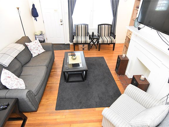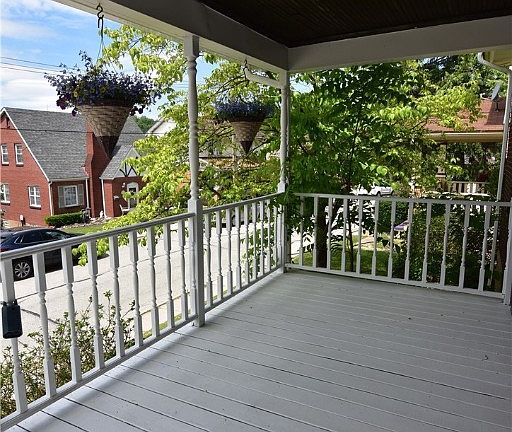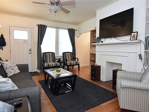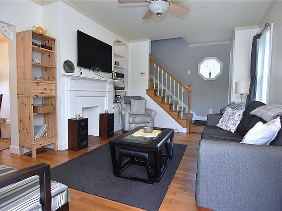 You'll feel right at home when you step onto the sprawling, covered porch of this lovely 2 story colonial style home. Open the front door and you'll immediately notice the exposed hardwood flooring that flows seamlessly between the living and dining room spaces. Decorative fireplace and built ins add character to the living area. Fully equipped kitchen offers walk out access to back patio, large, fenced in back yard with shed and off street parking. Extra large master bedroom can easily accommodate king size furniture and provides plenty of closet space. The second bedroom is also generously sized. Both bedrooms, main bath and upstairs hallway feature newer flooring. Decorative ledge on main staircase offers a perfect place to display treasured possessions. Unfinished, full basement has potential for finished gameroom area.