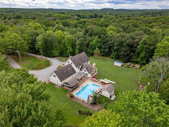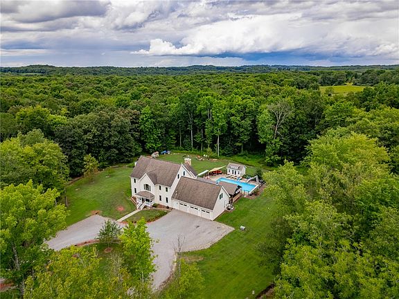 Discover country living at its finest in this stunning 3 story home offering 4290 sq ft of living space, perfectly designed for comfort and entertaining. A large, beautifully designed kitchen serves as the heart of the home, while the 2 story family room with a cozy fireplace creates a warm space for gatherings. In addition, a separate 688 sq ft 1 bedroom apartment above the garage provides the perfect space for guests, extended family, or rental income. Free gas to house from shallow gas well. Step outside to your private oasis featuring an inground pool with trex decking, a fully equipped outdoor kitchen/bar, and a pool house with a half bath and changing area. The home sits on a remarkable 73.06 ac property, giving you privacy, space, and endless possibilities for recreation or expansion. It is built with durable Hardie Plank siding. Unfinished basement floor is plumbed for radiant heat. Basement has superior walls.